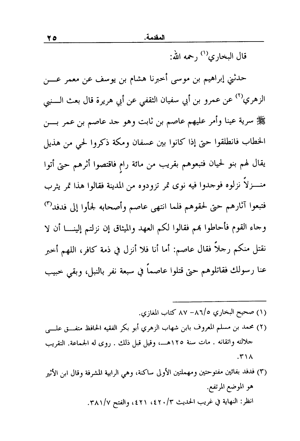 قال البخاري1 رحمه الله: "حدثني إبراهيم بن موسى أخبرنا هشام بن يوسف عن معمر عن الزهري2 عن عمرو بن أبي سفيان الثقفي عن أبي هريرة قال بعث النبي صلى الله عليه وسلم سرية عينا وأمر عليهم عاصم بن ثابت وهو جد عاصم بن عمر بن الخطاب فانطلقوا حتى إذا كانوا بين عسفان ومكة ذكروا لحي من هذيل يقال لهم بنو لحيان فتبعوهم بقريب من مائة رامٍ فاقتصوا أثرهم حتى أتوا منزلاً نزلوه فوجدوا فيه نوى تمر تزودوه من المدينة فقالوا هذا تمر يثرب فتبعوا آثارهم حتى لحقوهم فلما انتهى عاصم وأصحابه لجأوا إلى فدفد3 وجاء القوم فأحاطوا بهم فقالوا لكم العهد والميثاق إن نزلتم إلينا أن لا نقتل منكم رجلاً فقال عاصم: أما أنا فلا أنزل في ذمة كافر، اللهم أخبر عنا رسولك فقاتلوهم حتى قتلوا عاصماً في سبعة نفر بالنبل، وبقي خبيب