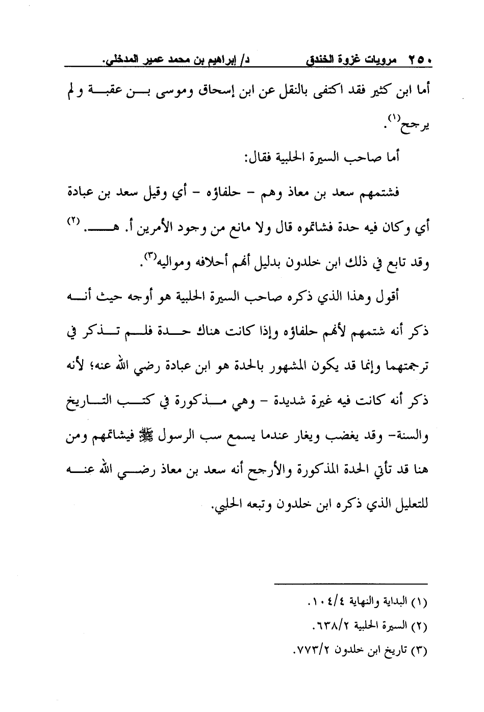 أقول وهذا الذي ذكره صاحب السيرة الحلبية هو أوجه حيث أنه ذكر أنه شتمهم لأنهم حلفاؤه وإذا كانت هناك حدة فلم تذكر في ترجمتهما وإنما قد يكون المشهور بالحدة هو ابن عبادة رضي الله عنه؛ لأنه ذكر أنه كانت فيه غيرة شديدة - وهي مذكورة في كتب التاريخ والسنة- وقد يغضب ويغار عندما يسمع سب الرسول صلى الله عليه وسلم فيشاتمهم ومن هنا قد تأتي الحدة المذكورة والأرجح أنه سعد بن معاذ رضي الله عنه للتعليل الذي ذكره ابن خلدون وتبعه الحلبي.