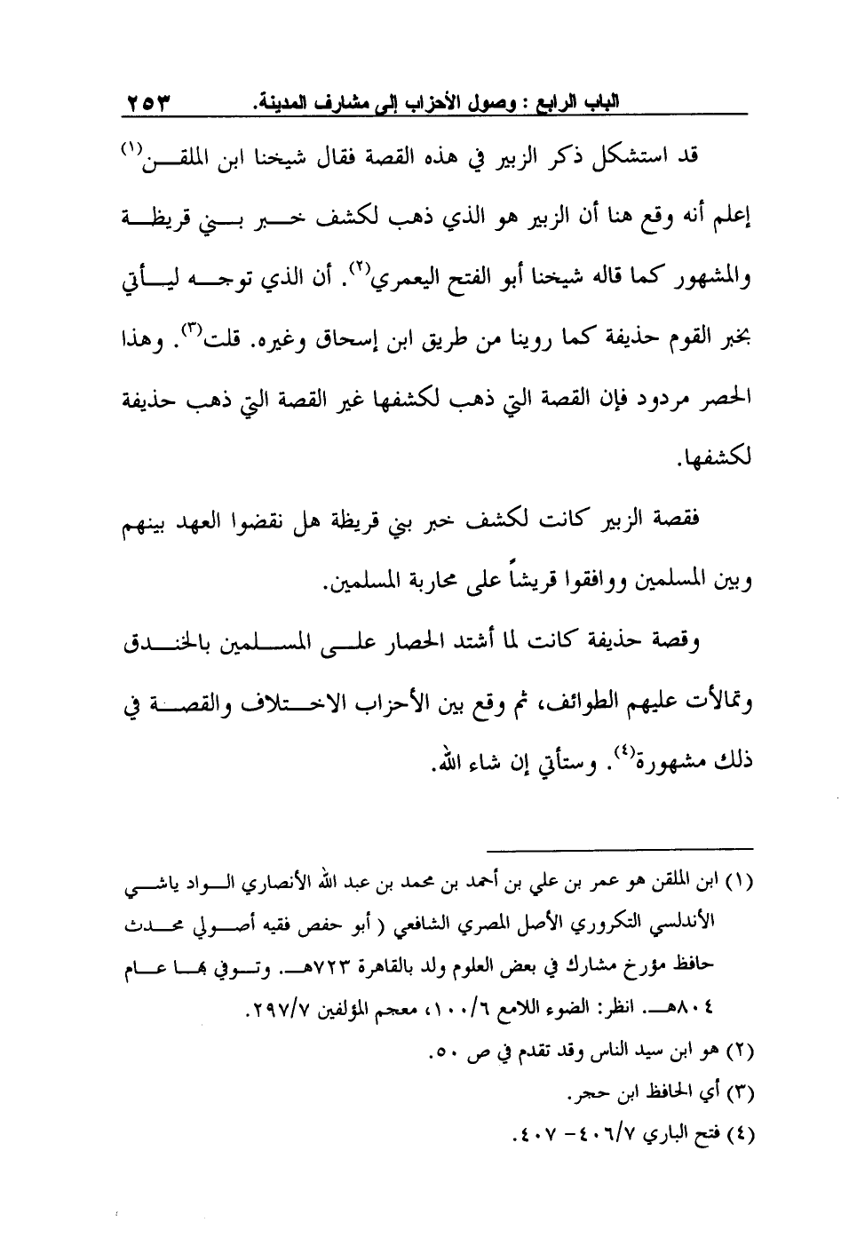 "قد استشكل ذكر الزبير في هذه القصة فقال شيخنا ابن الملقن1 اعلم أنه وقع هنا أن الزبير هو الذي ذهب لكشف خبر بني قريظة والمشهور كما قاله شيخنا أبو الفتح اليعمري"2. أن الذي توجه ليأتي بخبر القوم حذيفة كما روينا من طريق ابن إسحاق وغيره. قلت3. وهذا الحصر مردود فإن القصة التي ذهب لكشفها غير القصة التي ذهب حذيفة لكشفها.