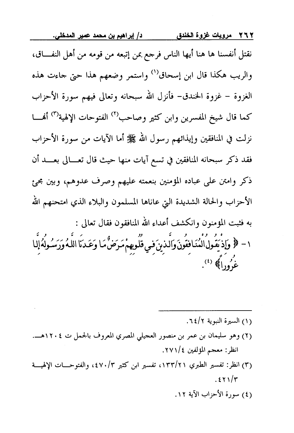 نقتل أنفسنا ها هنا أيها الناس فرجع بمن إتبعه من قومه من أهل النفاق، والريب هكذا قال ابن إسحاق1 واستمر وضعهم هذا حتى جاءت هذه الغزوة - غزوة الخندق- فأنزل الله سبحانه وتعالى فيهم سورة الأحزاب كما قال شيخ المفسرين وابن كثير وصاحب2 الفتوحات الإلهية3 أنها نزلت في المنافقين وإيذائهم رسول الله صلى الله عليه وسلم أما الآيات من سورة الأحزاب فقد ذكر سبحانه المنافقين في تسع آيات منها حيث قال تعالى بعد أن ذكر وامتن على عباده المؤمنين بنعمته عليهم وصرف عدوهم، وبين مجئ الأحزاب والحالة الشديدة التي عاناها المسلمون والبلاء الذي امتحنهم الله به فثبت المؤمنون وانكشف أعداء الله المنافقون فقال تعالى: