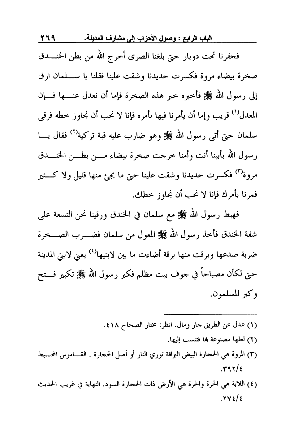 فهبط رسول الله صلى الله عليه وسلم مع سلمان في الخندق ورقينا نحن التسعة على شفة الخندق فأخذ رسول الله صلى الله عليه وسلم المعول من سلمان فضرب الصخرة ضربة صدعها وبرقت منها برقة أضاءت ما بين لابتيها4 يعني لابتي المدينة حتى لكأن مصباحاً في جوف بيت مظلم فكبر رسول الله صلى الله عليه وسلم تكبير فتح وكبر المسلمون.