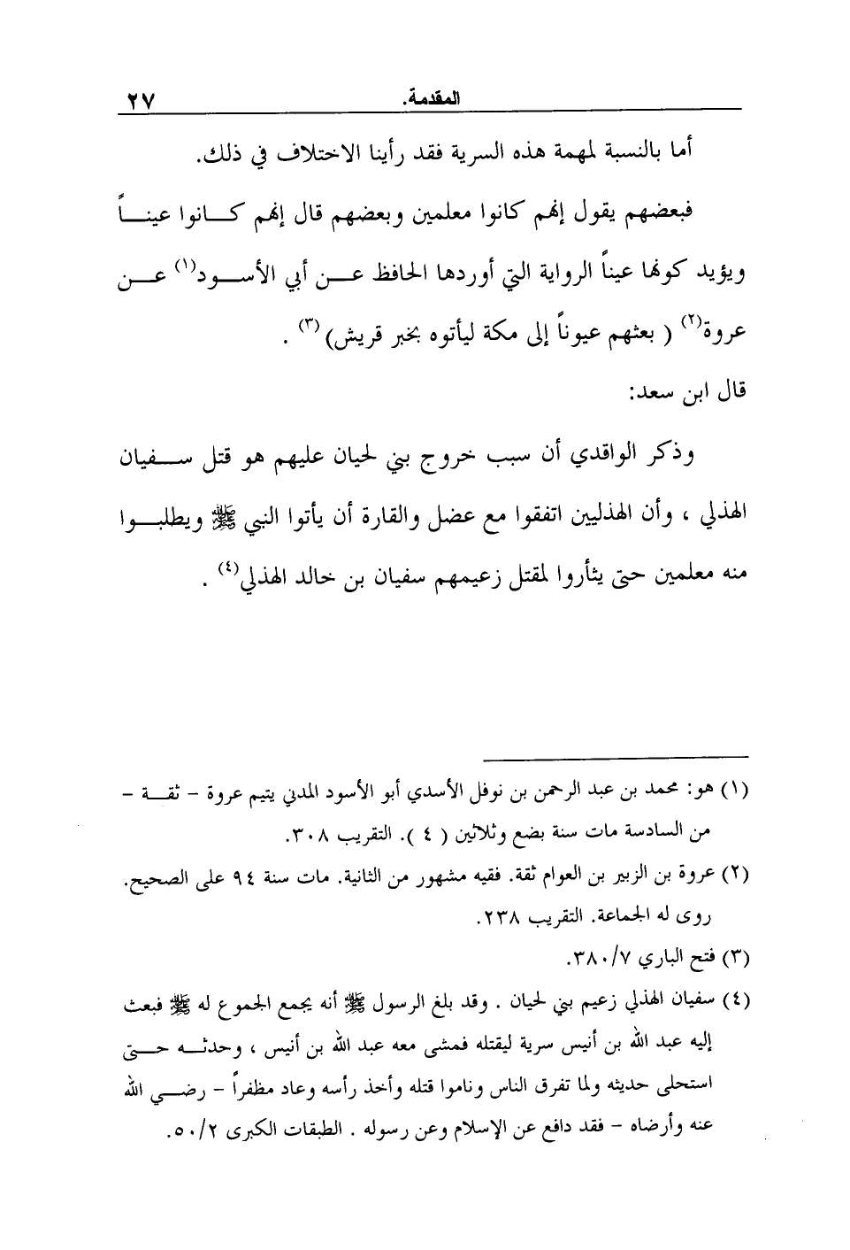 4 سفيان الهذلي زعيم بني لحيان. وقد بلغ الرسول صلى الله عليه وسلم أنه يجمع الجموع له صلى الله عليه وسلم فبعث إليه عبد الله بن أنيس سرية ليقتله فمشى معه عبد الله بن أنيس، وحدثه حتى استحلى حديثه ولما تفرق الناس وناموا قتله وأخذ رأسه وعاد مظفراً - رضي الله عنه وأرضاه - فقد دافع عن الإسلام وعن رسوله. الطبقات الكبرى 2/50.