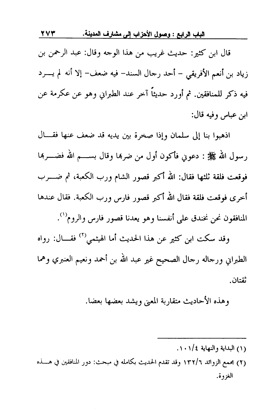 قال ابن كثير: "حديث غريب من هذا الوجه وقال: عبد الرحمن بن زياد بن أنعم الأفريقي - أحد رجال السند- فيه ضعف- إلا أنه لم يرد فيه ذكر للمنافقين. ثم أورد حديثاً آخر عند الطبراني وهو عن عكرمة عن ابن عباس وفيه قال: "اذهبوا بنا إلى سلمان وإذا صخرة بين يديه قد ضعف عنها فقال رسول الله صلى الله عليه وسلم: "دعوني فأكون أول من ضربها وقال بسم الله فضربها فوقعت فلقة ثلثها فقال: الله أكبر قصور الشام ورب الكعبة، ثم ضرب أخرى فوقعت فلقة فقال الله أكبر قصور فارس ورب الكعبة. فقال عندها المنافقون نحن نخندق على أنفسنا وهو يعدنا قصور فارس والروم" 1.