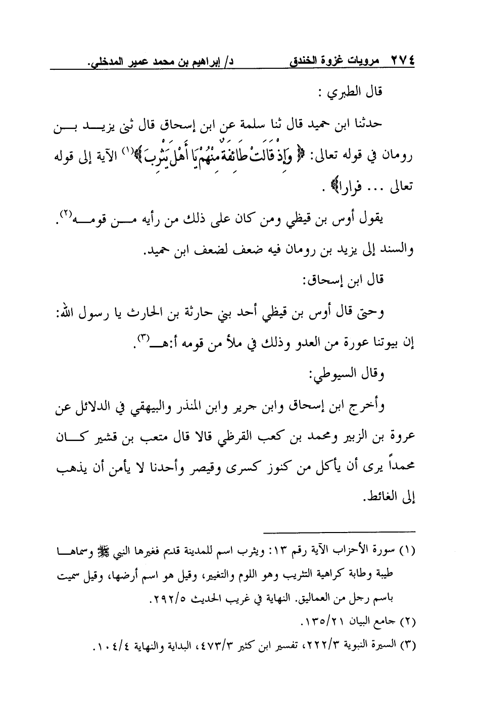 قال الطبري: حدثنا ابن حميد قال ثنا سلمة عن ابن إسحاق قال ثنى يزيد بن رومان في قوله تعالى: {وَإِذْ قَالَتْ طَائِفَةٌ مِنْهُمْ يَا أَهْلَ يَثْرِبَ} 1 الآية إلى قوله تعالى … فرارا} .