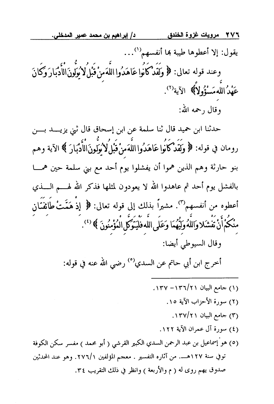 وقال رحمه الله: حدثنا ابن حميد قال ثنا سلمة عن ابن إسحاق قال ثني يزيد بن رومان في قوله: {وَلَقَدْ كَانُوا عَاهَدُوا اللَّهَ مِنْ قَبْلُ لا يُوَلُّونَ الْأَدْبَارَ} الآية وهم بنو حارثة وهم الذين هموا أن يفشلوا يوم أحد مع بني سلمة حين هما بالفشل يوم أحد ثم عاهدوا الله لا يعودون لمثلها فذكر الله لهم الذي أعطوه من أنفسهم3. مشيراً بذلك إلى قوله تعالى: {إِذْ هَمَّتْ طَائِفَتَانِ مِنْكُمْ أَنْ تَفْشَلا وَاللَّهُ وَلِيُّهُمَا وَعَلَى اللَّهِ فَلْيَتَوَكَّلِ الْمُؤْمِنُونَ} 4.