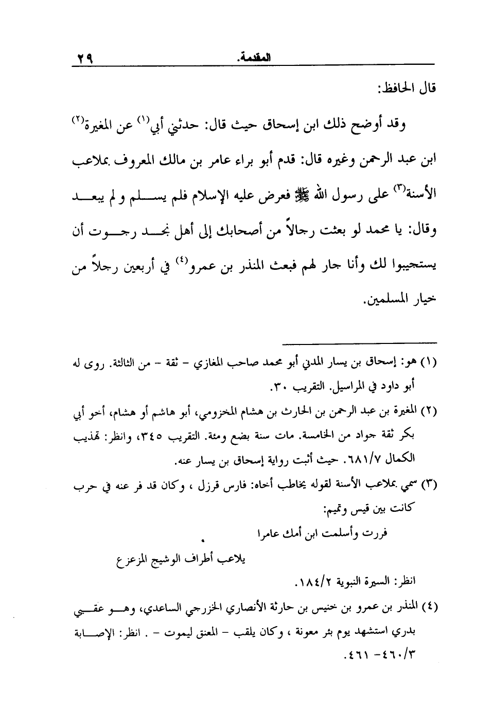 قال الحافظ: "وقد أوضح ذلك ابن إسحاق حيث قال: حدثني أبي1 عن المغيرة2 ابن عبد الرحمن وغيره قال: قدم أبو براء عامر بن مالك المعروف بملاعب الأسنة3 على رسول الله صلى الله عليه وسلم فعرض عليه الإسلام فلم يسلم ولم يبعد وقال: يا محمد لو بعثت رجالاً من أصحابك إلى أهل نجد رجوت أن يستجيبوا لك وأنا جار لهم فبعث المنذر بن عمرو4 في أربعين رجلاً من خيار المسلمين".