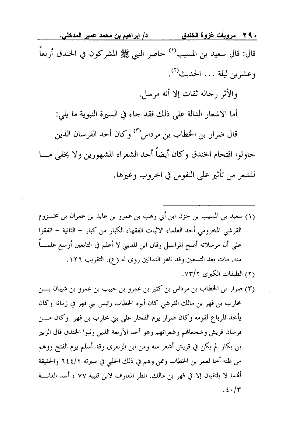 3 ضرار بن الخطاب بن مرداس بن كثير بن عمرو بن حبيب بن عمرو بن شيبان بن محارب بن فهر بن مالك القرشي كان أبوه الخطاب رئيس بني فهر في زمانه وكان يأخذ المرباع لقومه وكان ضرار يوم الفجار على بني محارب بن فهر وكان من فرسان قريش وشجعانهم وشعرائهم وهو أحد الأربعة الذين وثبوا الخندق قال الزبير بن بكار لم يكن في قريش أشعر منه ومن ابن الزبعرى وقد أسلم يوم الفتح ووهم من ظنه أخا لعمر بن الخطاب وممن وهم في ذلك الحلبي في سيرته 2/644 والحقيقة أنهما لا يلتقيان إلا في فهر بن مالك. انظر المعارف لابن قتيبة 77، أسد الغابة 3/40.