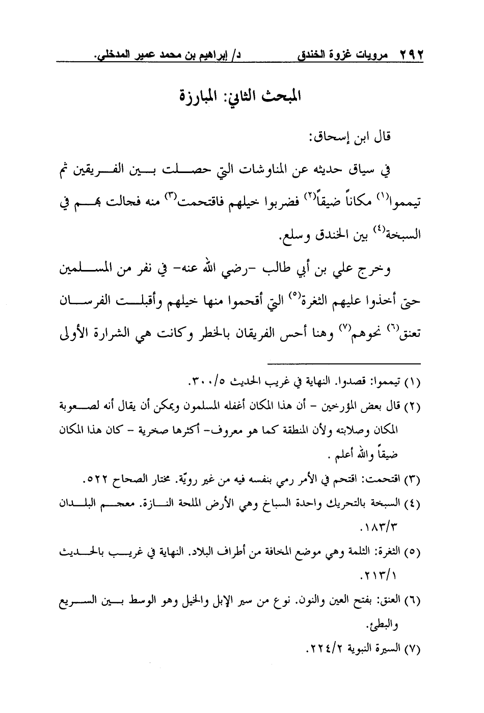 قال ابن إسحاق: "في سياق حديثه عن المناوشات التي حصلت بين الفريقين ثم تيمموا1 مكاناً ضيقاً2 فضربوا خيلهم فاقتحمت3 منه فجالت بهم في السبخة4 بين الخندق وسلع.