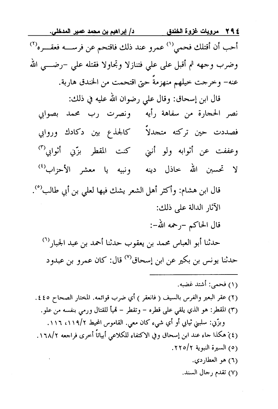 قال الحاكم -رحمه الله-: حدثنا أبو العباس محمد بن يعقوب حدثنا أحمد بن عبد الجبار6 حدثنا يونس بن بكير عن ابن إسحاق7 قال: "كان عمرو بن عبدود