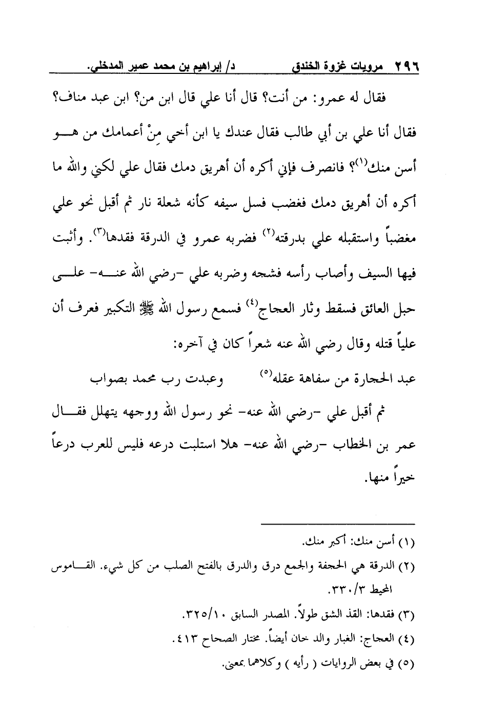 فقال له عمرو: من أنت؟ قال أنا علي قال ابن من؟ ابن عبد مناف؟ فقال أنا علي بن أبي طالب فقال عندك يا ابن أخي مِنْ أعمامك من هو أسن منك1؟ فانصرف فإني أكره أن أهريق دمك فقال علي لكني والله ما أكره أن أهريق دمك فغضب فسل سيفه كأنه شعلة نار ثم أقبل نحو علي مغضباً واستقبله علي بدرقته2 فضربه عمرو في الدرقة فقدها3. وأثبت فيها السيف وأصاب رأسه فشجه وضربه علي -رضي الله عنه- على حبل العائق فسقط وثار العجاج4 فسمع رسول الله صلى الله عليه وسلم التكبير فعرف أن علياً قتله وقال رضي الله عنه شعراً كان في آخره: