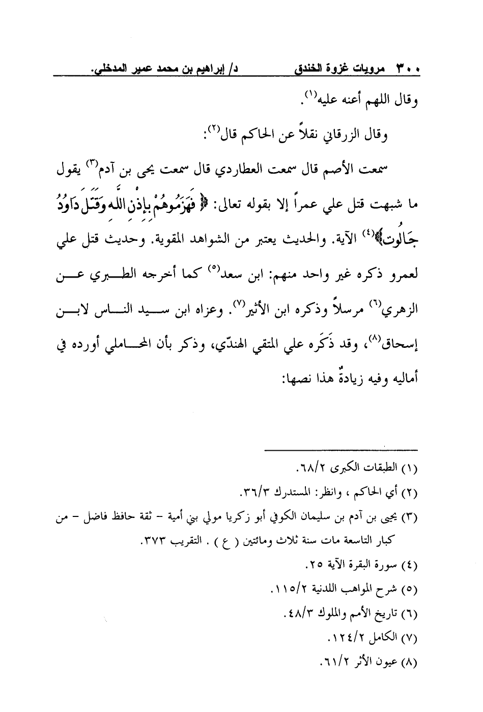 وقال الزرقاني نقلاً عن الحاكم قال2: سمعت الأصم قال سمعت العطاردي قال سمعت يحى بن آدم3 يقول ما شبهت قتل علي عمراً إلا بقوله تعالى: {فَهَزَمُوهُمْ بِإِذْنِ اللَّهِ وَقَتَلَ دَاوُدُ جَالُوت} 4 الآية. والحديث يعتبر من الشواهد المقوية. وحديث قتل علي لعمرو ذكره غير واحد منهم: ابن سعد5 كما أخرجه الطبري عن الزهري6 مرسلاً وذكره ابن الأثير7. وعزاه ابن سيد الناس لابن إسحاق8، وقد ذَكَره علي المتقي الهندّي، وذكر بأن المحاملي أورده في أماليه وفيه زيادةٌ هذا نصها: