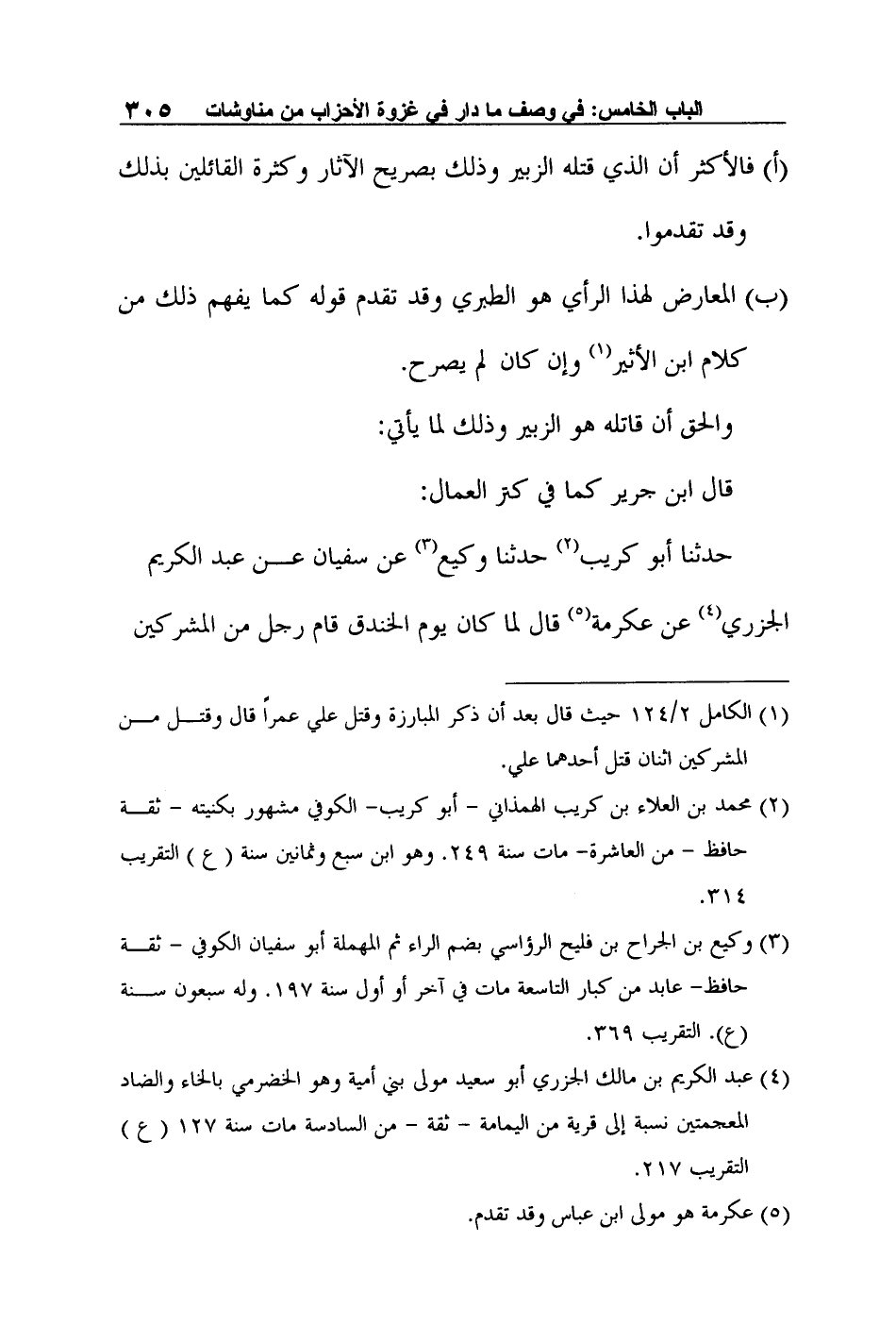 قال ابن جرير كما في كنز العمال: حدثنا أبو كريب2 حدثنا وكيع3 عن سفيان عن عبد الكريم الجزري4 عن عكرمة5 قال لما كان يوم الخندق قام رجل من المشركين