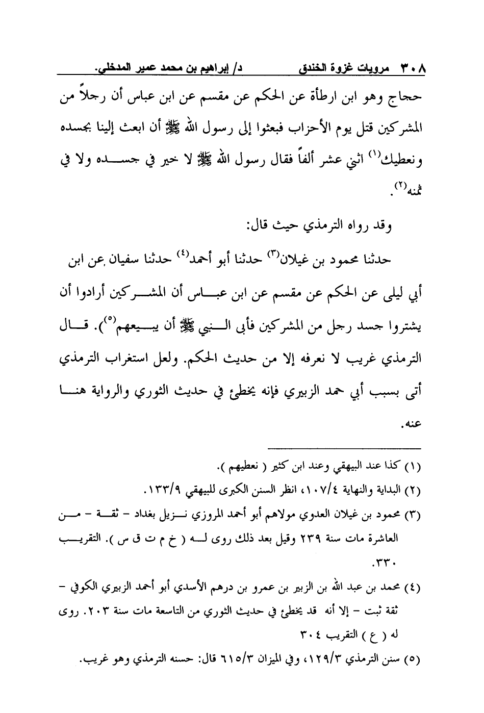وقد رواه الترمذي حيث قال: حدثنا محمود بن غيلان3 حدثنا أبو أحمد4 حدثنا سفيان عن ابن أبي ليلى عن الحكم عن مقسم عن ابن عباس: "أن المشركين أرادوا أن يشتروا جسد رجل من المشركين فأبى النبي صلى الله عليه وسلم أن يبيعهم"5. قال الترمذي: "غريب لا نعرفه إلا من حديث الحكم". ولعل استغراب الترمذي أتى بسبب أبي حمد الزبيري فإنه يخطئ في حديث الثوري والرواية هنا عنه.