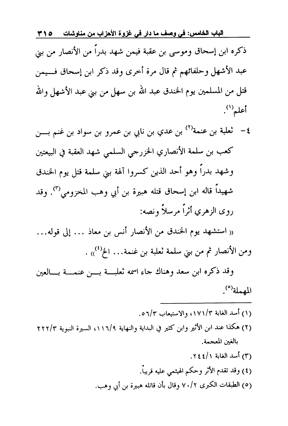 4- ثعلبة بن عنمة2 بن عدي بن نابي بن عمرو بن سواد بن غنم بن كعب بن سلمة الأنصاري الخزرجي السلمي شهد العقبة في البيعتين وشهد بدراً وهو أحد الذين كسروا آلهة بني سلمة قتل يوم الخندق شهيداً قاله ابن إسحاق قتله هبيرة بن أبي وهب المخزومي3. وقد روى الزهري أثراً مرسلاً ونصه: "استشهد يوم الخندق من الأنصار أنس بن معاذ … إلى قوله… ومن الأنصار ثم من بني سلمة ثعلبة بن غنمة… الخ4".
