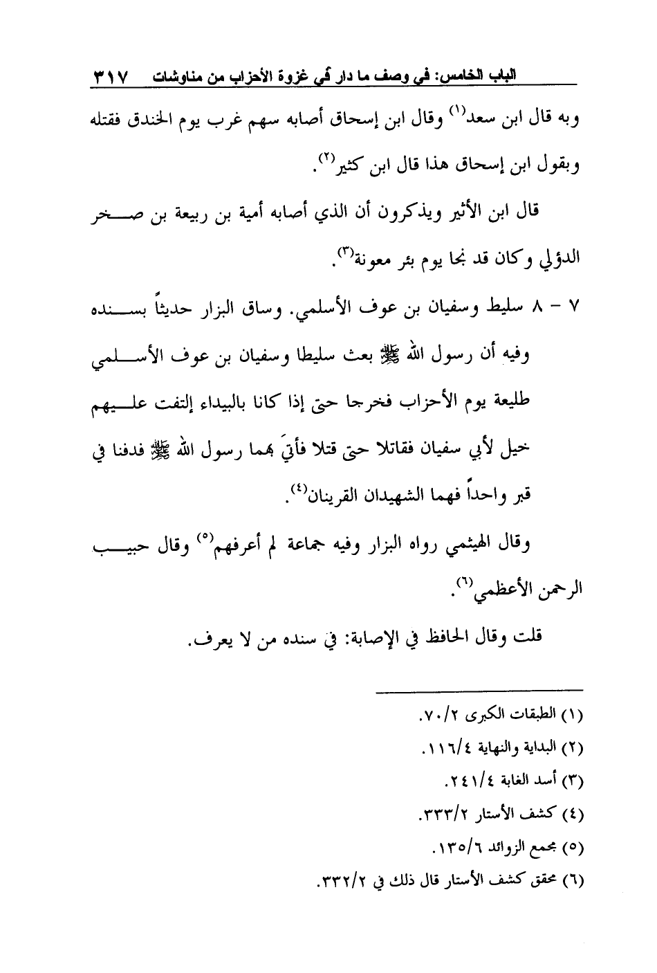 7 - 8 سليط وسفيان بن عوف الأسلمي. وساق البزار حديثاً بسنده وفيه أن رسول الله صلى الله عليه وسلم بعث سليطا وسفيان بن عوف الأسلمي طليعة يوم الأحزاب فخرجا حتى إذا كانا بالبيداء إلتفت عليهم خيل لأبي سفيان فقاتلا حتى قتلا فأتيَ بهما رسول الله صلى الله عليه وسلم فدفنا في قبر واحداً فهما الشهيدان القرينان4.
