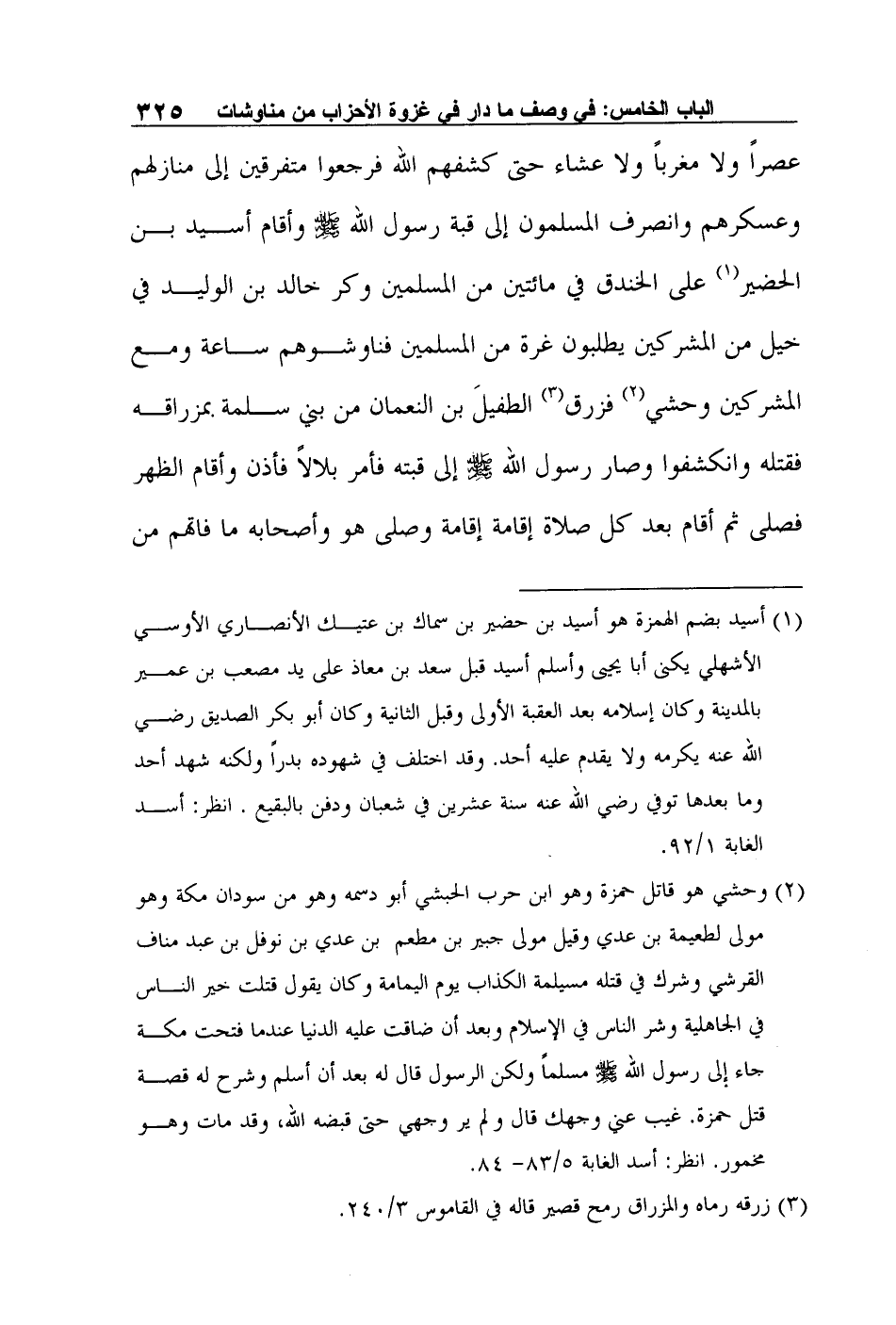 عصراً ولا مغرباً ولا عشاء حتى كشفهم الله فرجعوا متفرقين إلى منازلهم وعسكرهم وانصرف المسلمون إلى قبة رسول الله صلى الله عليه وسلم وأقام أسيد بن الحضير1 على الخندق في مائتين من المسلمين وكر خالد بن الوليد في خيل من المشركين يطلبون غرة من المسلمين فناوشوهم ساعة ومع المشركين وحشي2 فزرق3 الطفيلَ بن النعمان من بني سلمة بمزراقه فقتله وانكشفوا وصار رسول الله صلى الله عليه وسلم إلى قبته فأمر بلالاً فأذن وأقام الظهر فصلى ثم أقام بعد كل صلاة إقامة إقامة وصلى هو وأصحابه ما فاتهم من
