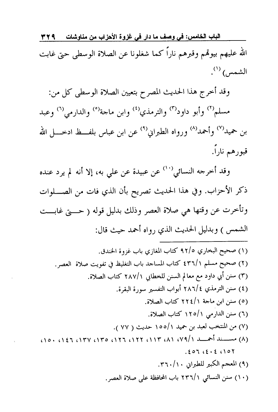 وقد أخرج هذا الحديث المصرح بتعيين الصلاة الوسطى كل من: مسلم2 وأبو داود3 والترمذي4 وابن ماجة5 والدارمي6 وعبد بن حميد7 وأحمد8 ورواه الطبراني9 عن ابن عباس بلفظ ادخل الله قبورهم ناراً.