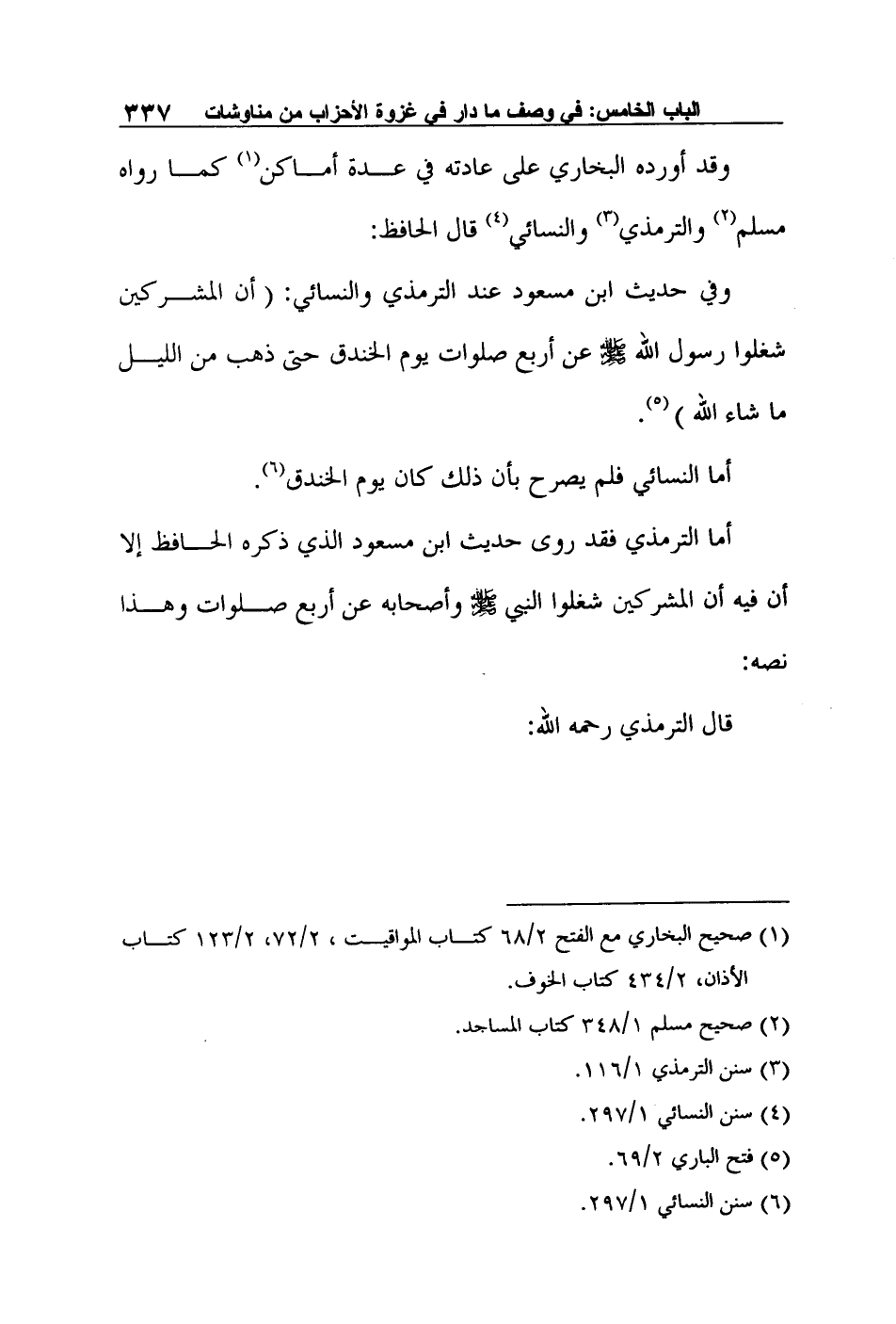 وفي حديث ابن مسعود عند الترمذي والنسائي: "أن المشركين شغلوا رسول الله صلى الله عليه وسلم عن أربع صلوات يوم الخندق حتى ذهب من الليل ما شاء الله"5.