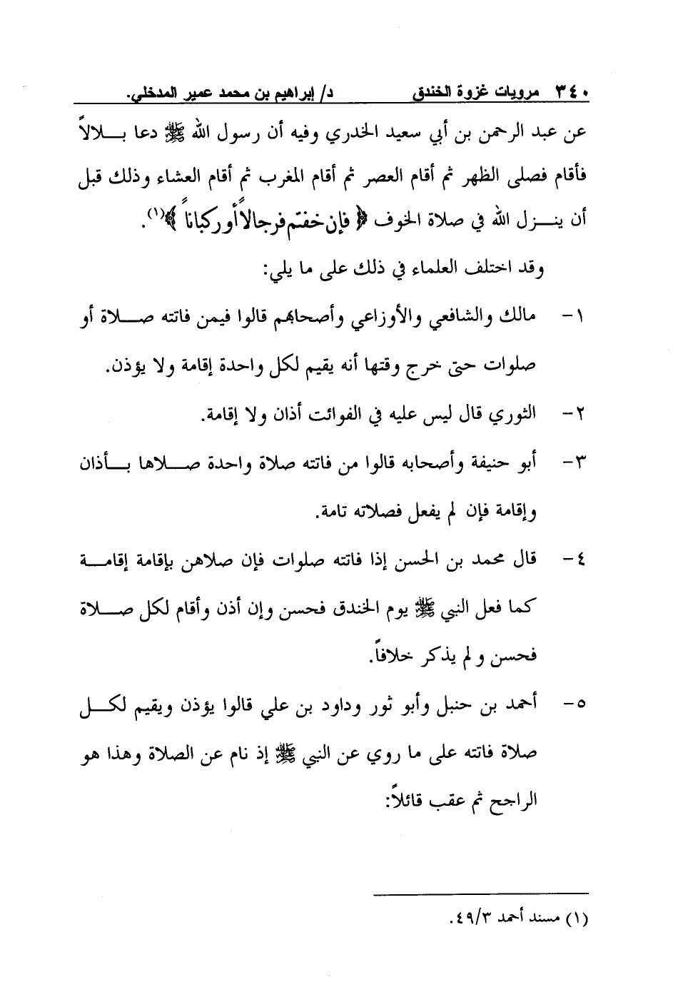5- أحمد بن حنبل وأبو ثور وداود بن علي قالوا يؤذن ويقيم لكل صلاة فاتته على ما روي عن النبي صلى الله عليه وسلم إذ نام عن الصلاة وهذا هو الراجح ثم عقب قائلاً: