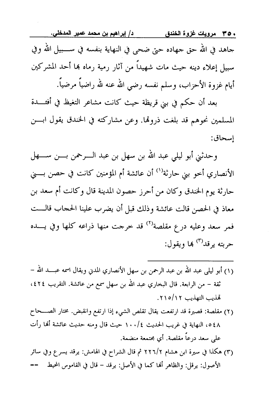 وحدثني أبو ليلي عبد الله بن سهل بن عبد الرحمن بن سهل الأنصاري أخو بني حارثة1 أن عائشة أم المؤمنين كانت في حصن بني حارثة يوم الخندق وكان من أحرز حصون المدينة قال وكانت أم سعد بن معاذ في الحصن قالت عائشة وذلك قبل أن يضرب علينا الحجاب قالت فمر سعد وعليه درع مقلصة2 قد خرجت منها ذراعه كلها وفي يده حربته يرقد3 بها ويقول: