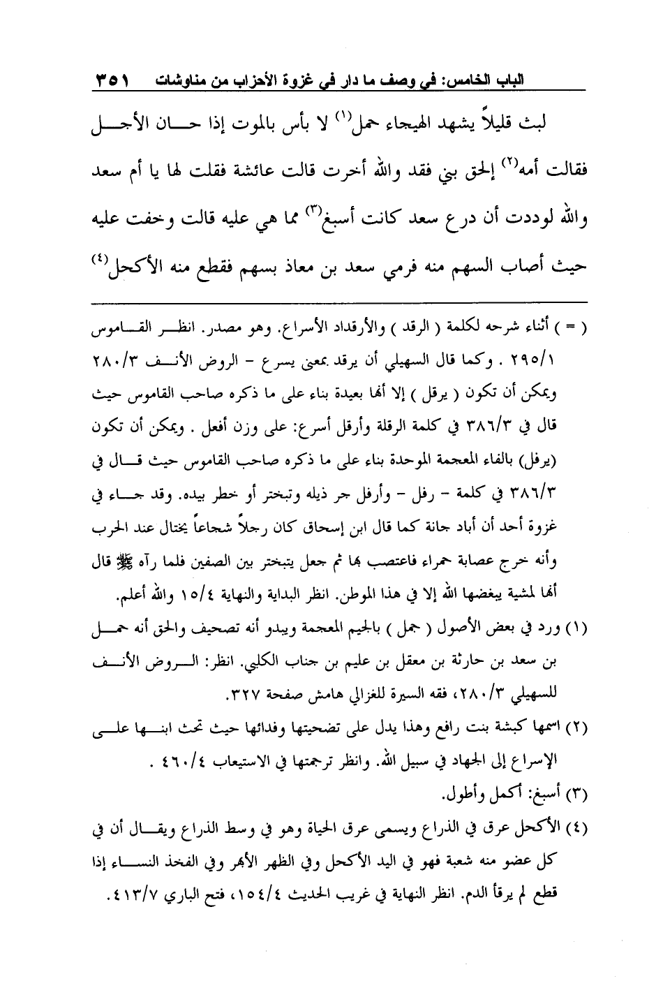"لبث قليلاً يشهد الهيجاء حمل1 لا بأس بالموت إذا حان الأجل فقالت أمه2 إلحق بني فقد والله أخرت قالت عائشة فقلت لها يا أم سعد والله لوددت أن درع سعد كانت أسبغ3 مما هي عليه قالت وخفت عليه حيث أصاب السهم منه فرمي سعد بن معاذ بسهم فقطع منه الأكحل4