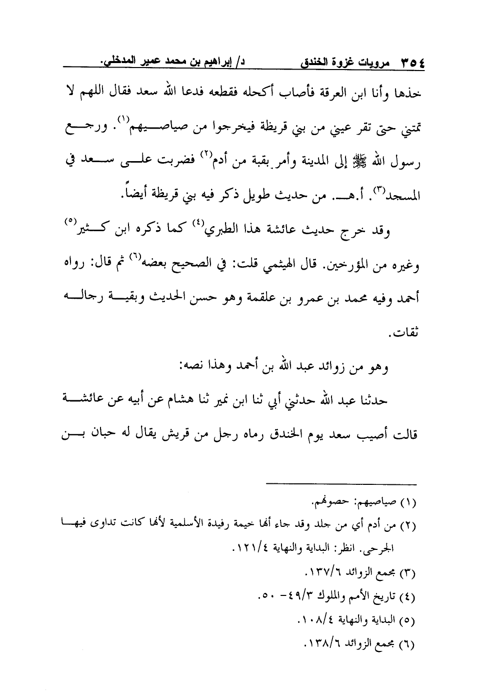 حدثنا عبد الله حدثني أبي ثنا ابن نمير ثنا هشام عن أبيه عن عائشة قالت: "أصيب سعد يوم الخندق رماه رجل من قريش يقال له حبان بن