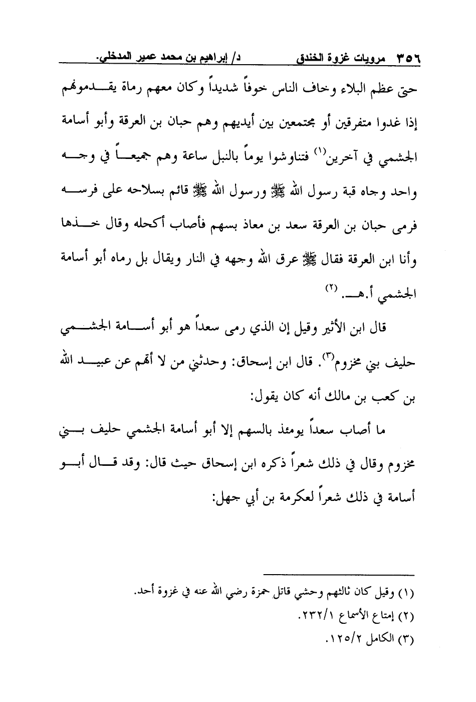 "حتى عظم البلاء وخاف الناس خوفاً شديداً وكان معهم رماة يقدمونهم إذا غدوا متفرقين أو مجتمعين بين أيديهم وهم حبان بن العرقة وأبو أسامة الجشمي في آخرين1 فتناوشوا يوماً بالنبل ساعة وهم جميعاً في وجه واحد وجاه قبة رسول الله صلى الله عليه وسلم ورسول الله صلى الله عليه وسلم قائم بسلاحه على فرسه فرمى حبان بن العرقة سعد بن معاذ بسهم فأصاب أكحله وقال خذها وأنا ابن العرقة فقال صلى الله عليه وسلم عرق الله وجهه في النار ويقال بل رماه أبو أسامة الجشمي" أ. هـ. 2