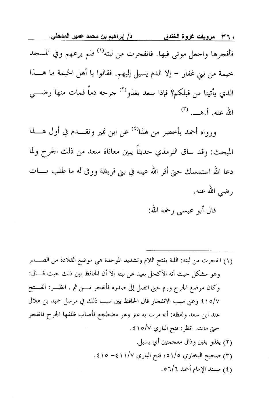 ورواه أحمد بأخصر من هذا4 عن ابن نمير وتقدم في أول هذا المبحث: "وقد ساق الترمذي حديثاً يبين معاناة سعد من ذلك الجرح ولما دعا الله استمسك حتى أقر الله عينه في بني قريظة ووفى له ما طلب مات رضي الله عنه.