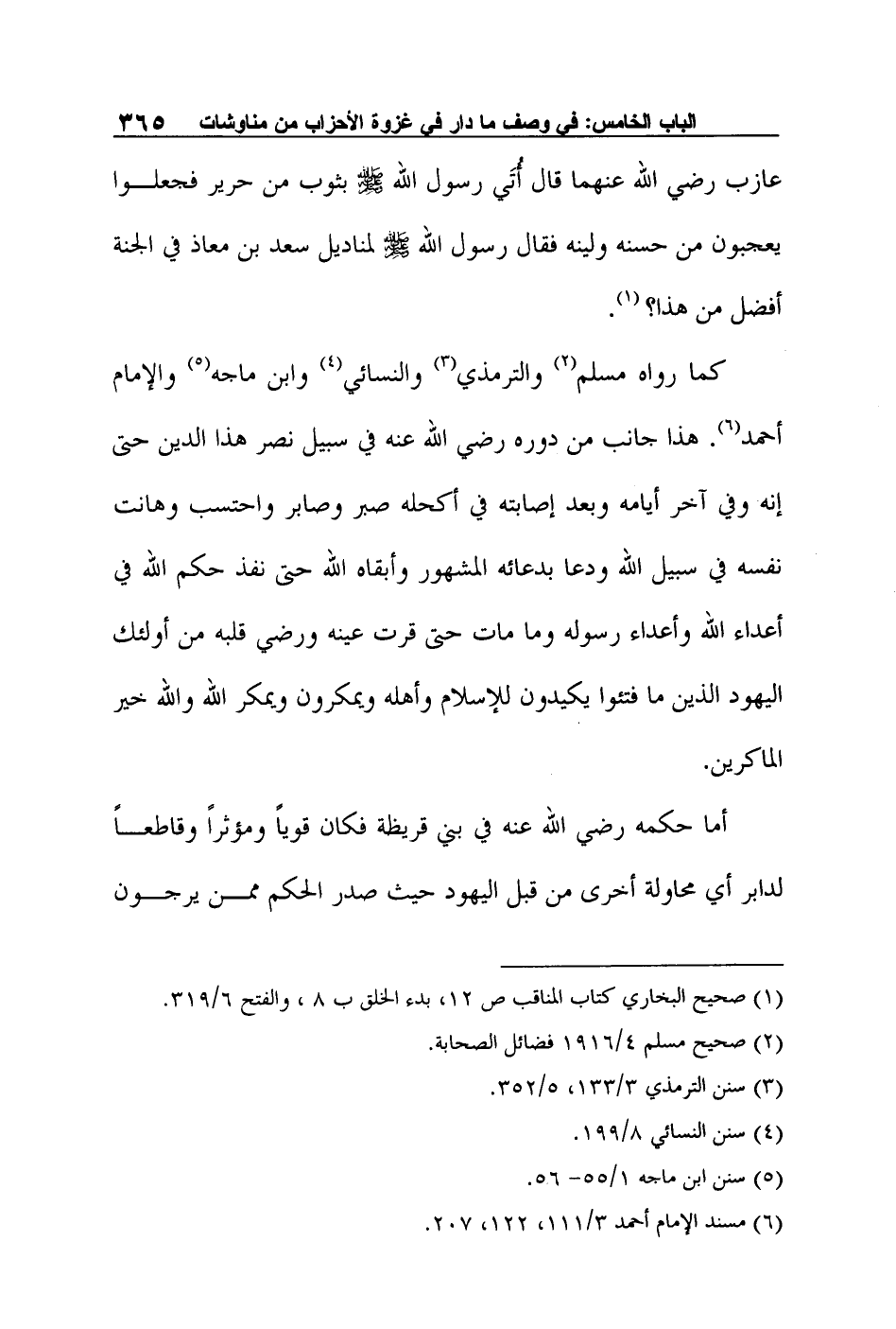 كما رواه مسلم2 والترمذي3 والنسائي4 وابن ماجه5 والإمام أحمد6. هذا جانب من دوره رضي الله عنه في سبيل نصر هذا الدين حتى إنه وفي آخر أيامه وبعد إصابته في أكحله صبر وصابر واحتسب وهانت نفسه في سبيل الله ودعا بدعائه المشهور وأبقاه الله حتى نفذ حكم الله في أعداء الله وأعداء رسوله وما مات حتى قرت عينه ورضي قلبه من أولئك اليهود الذين ما فتئوا يكيدون للإسلام وأهله ويمكرون ويمكر الله والله خير الماكرين.