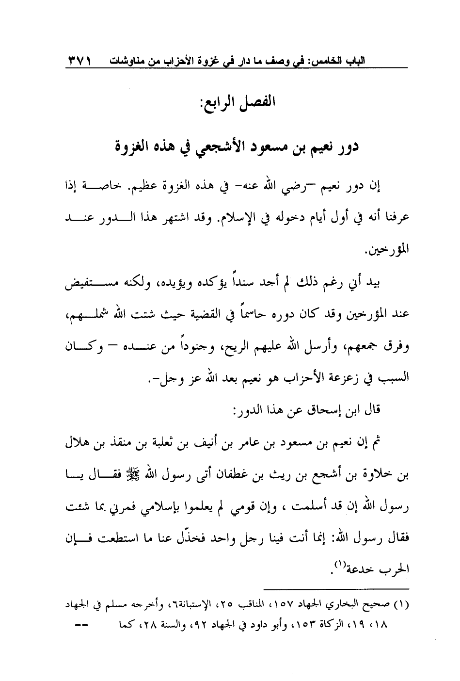بيد أني رغم ذلك لم أجد سنداً يؤكده ويؤيده، ولكنه مستفيض عند المؤرخين وقد كان دوره حاسماً في القضية حيث شتت الله شملهم، وفرق جمعهم، وأرسل الله عليهم الريح، وجنوداً من عنده – وكان السبب في زعزعة الأحزاب هو نعيم بعد الله عز وجل-.