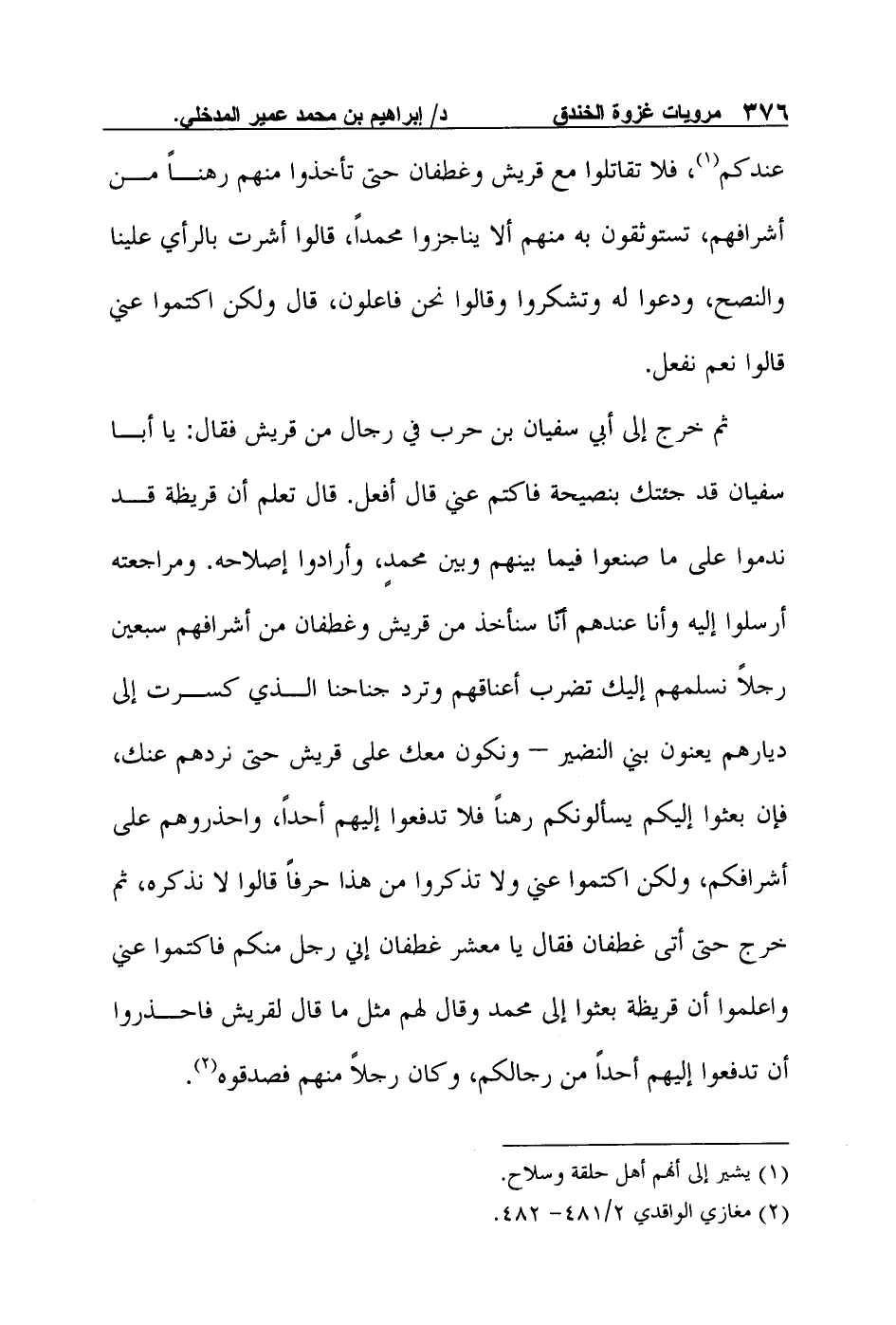 عندكم1، فلا تقاتلوا مع قريش وغطفان حتى تأخذوا منهم رهناً من أشرافهم، تستوثقون به منهم ألا يناجزوا محمداً، قالوا أشرت بالرأي علينا والنصح، ودعوا له وتشكروا وقالوا نحن فاعلون، قال ولكن اكتموا عني قالوا نعم نفعل.