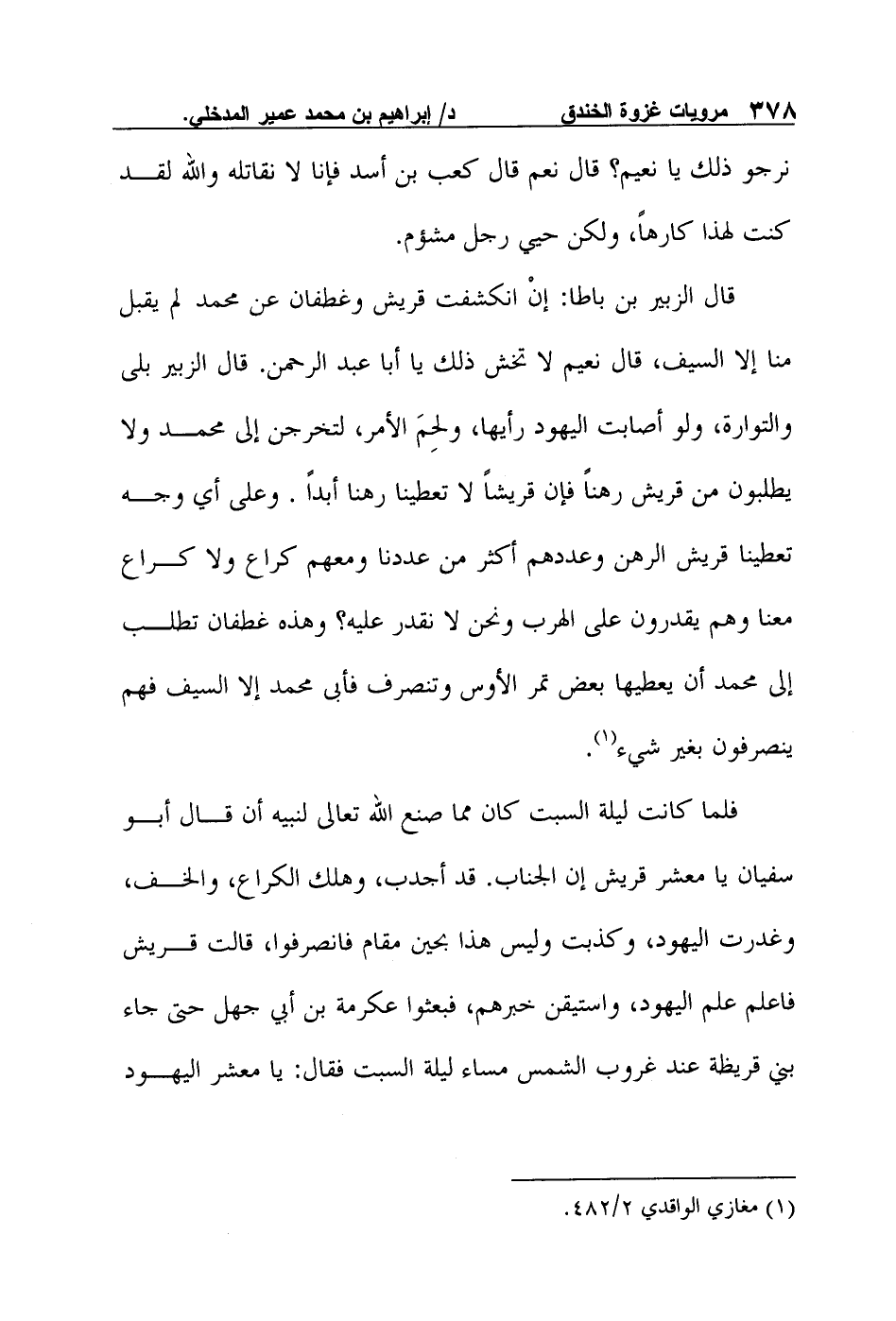 نرجو ذلك يا نعيم؟ قال نعم قال كعب بن أسد فإنا لا نقاتله والله لقد كنت لهذا كارهاً، ولكن حيي رجل مشؤم".