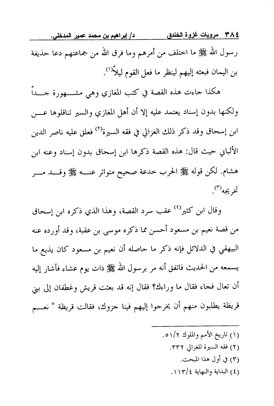 وقال ابن كثير4 عقب سرد القصة،: "وهذا الذي ذكره ابن إسحاق من قصة نعيم بن مسعود أحسن مما ذكره موسى بن عقبة، وقد أورده عنه البيهقي في الدلائل فإنه ذكر ما حاصله أن نعيم بن مسعود كان يذيع ما يسمعه من الحديث فاتفق أنه مر برسول الله صلى الله عليه وسلم ذات يوم عشاء فأشار إليه أن تعال فجاء فقال ما وراءك؟ فقال إنه قد بعثت قريش وغطفان إلى بني قريظة يطلبون منهم أن يخرجوا إليهم فينا جزوك، فقالت قريظة " نعم