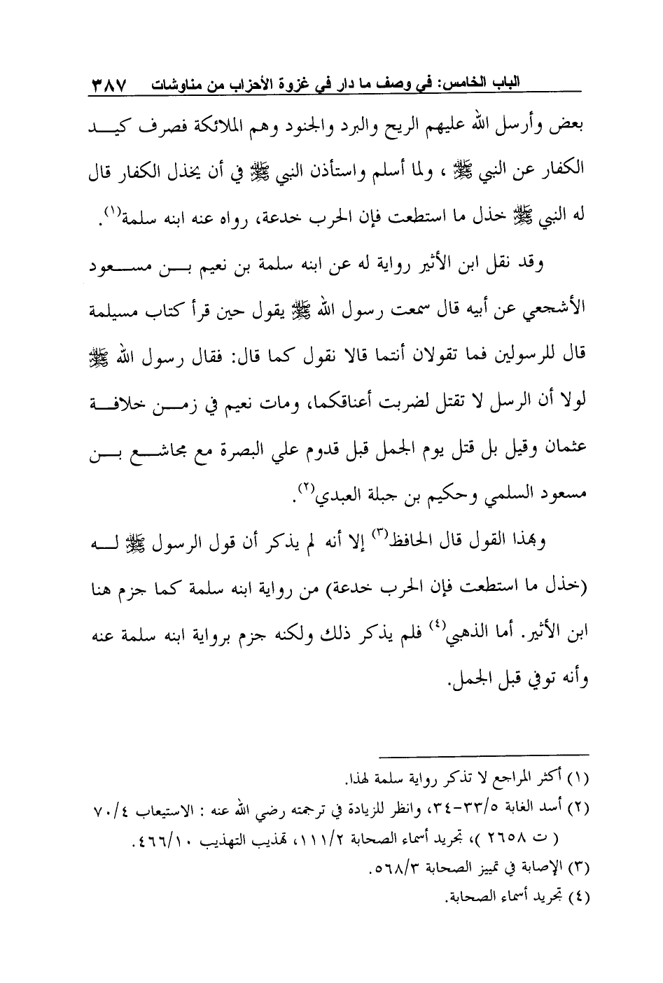 وبهذا القول قال الحافظ3 إلا أنه لم يذكر أن قول الرسول صلى الله عليه وسلم له: "خذل ما استطعت فإن الحرب خدعة" من رواية ابنه سلمة كما جزم هنا ابن الأثير. أما الذهبي4 فلم يذكر ذلك ولكنه جزم برواية ابنه سلمة عنه وأنه توفي قبل الجمل.