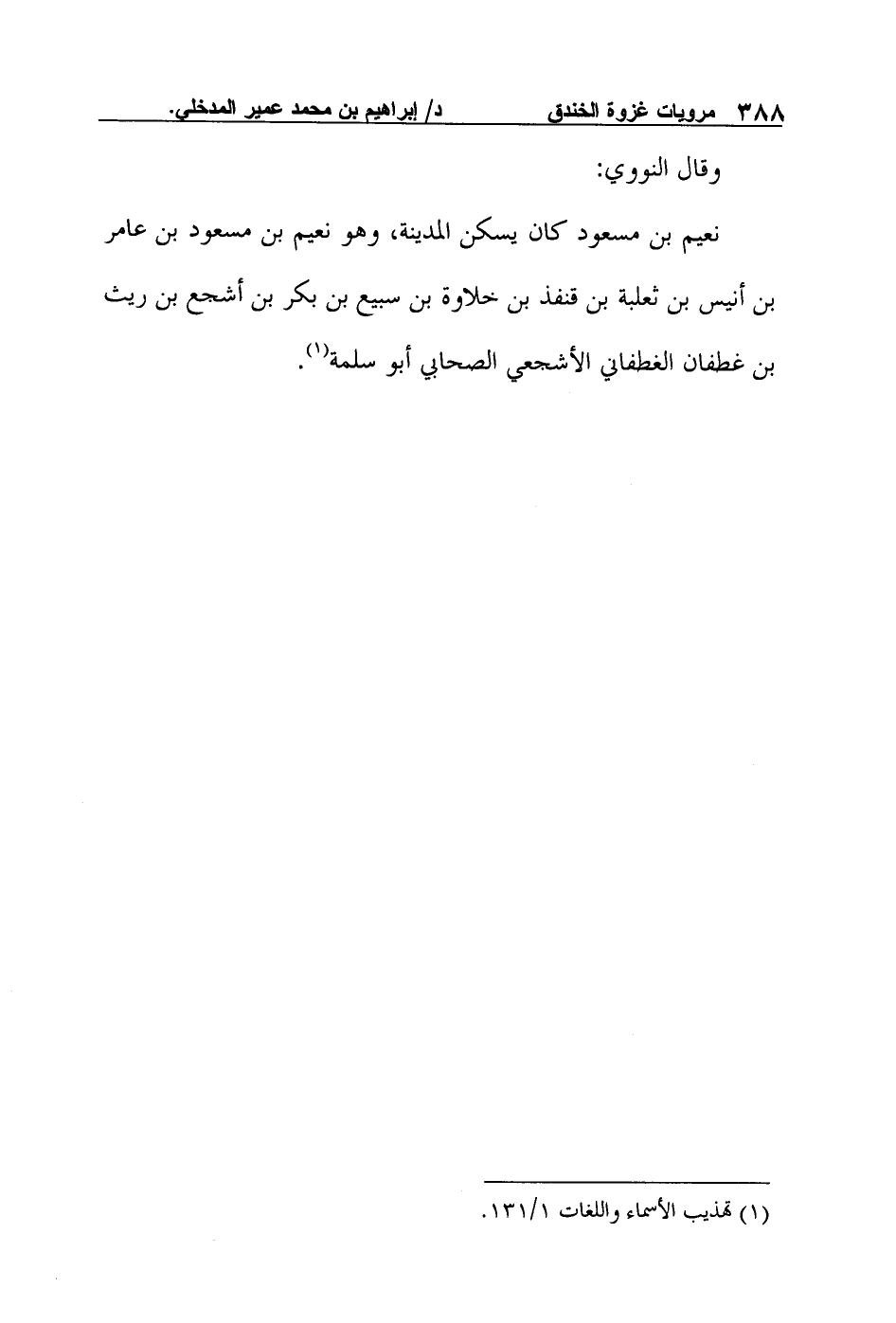 وقال النووي: "نعيم بن مسعود كان يسكن المدينة، وهو نعيم بن مسعود بن عامر بن أنيس بن ثعلبة بن قنفذ بن خلاوة بن سبيع بن بكر بن أشجع بن ريث بن غطفان الغطفاني الأشجعي الصحابي أبو سلمة"1.