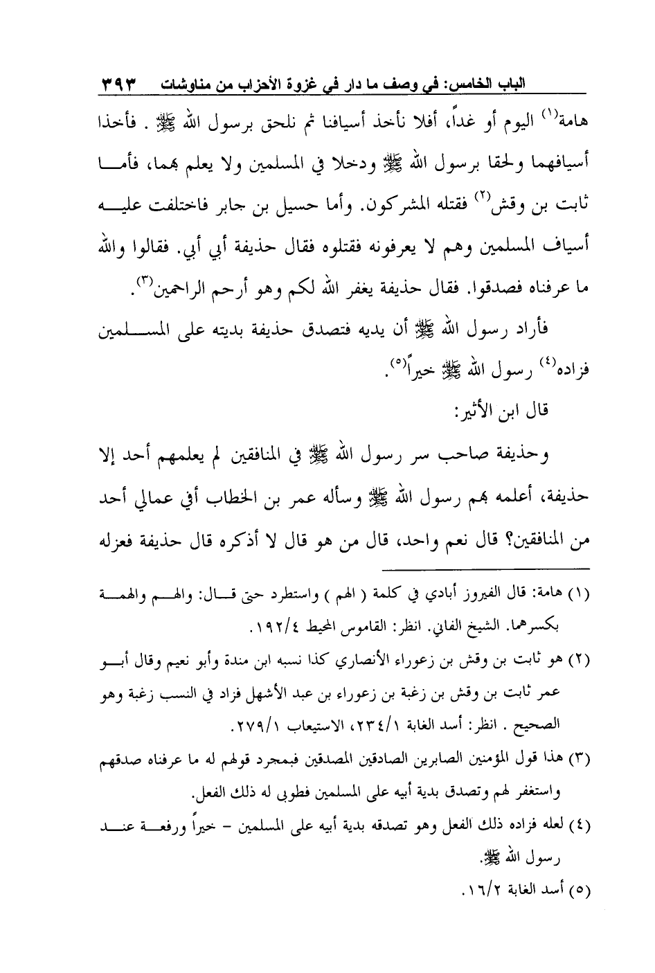 هامة1 اليوم أو غداً، أفلا نأخذ أسيافنا ثم نلحق برسول الله صلى الله عليه وسلم. فأخذا أسيافهما ولحقا برسول الله صلى الله عليه وسلم ودخلا في المسلمين ولا يعلم بهما، فأما ثابت بن وقش2 فقتله المشركون. وأما حسيل بن جابر فاختلفت عليه أسياف المسلمين وهم لا يعرفونه فقتلوه فقال حذيفة أبي أبي. فقالوا والله ما عرفناه فصدقوا. فقال حذيفة يغفر الله لكم وهو أرحم الراحمين"3.