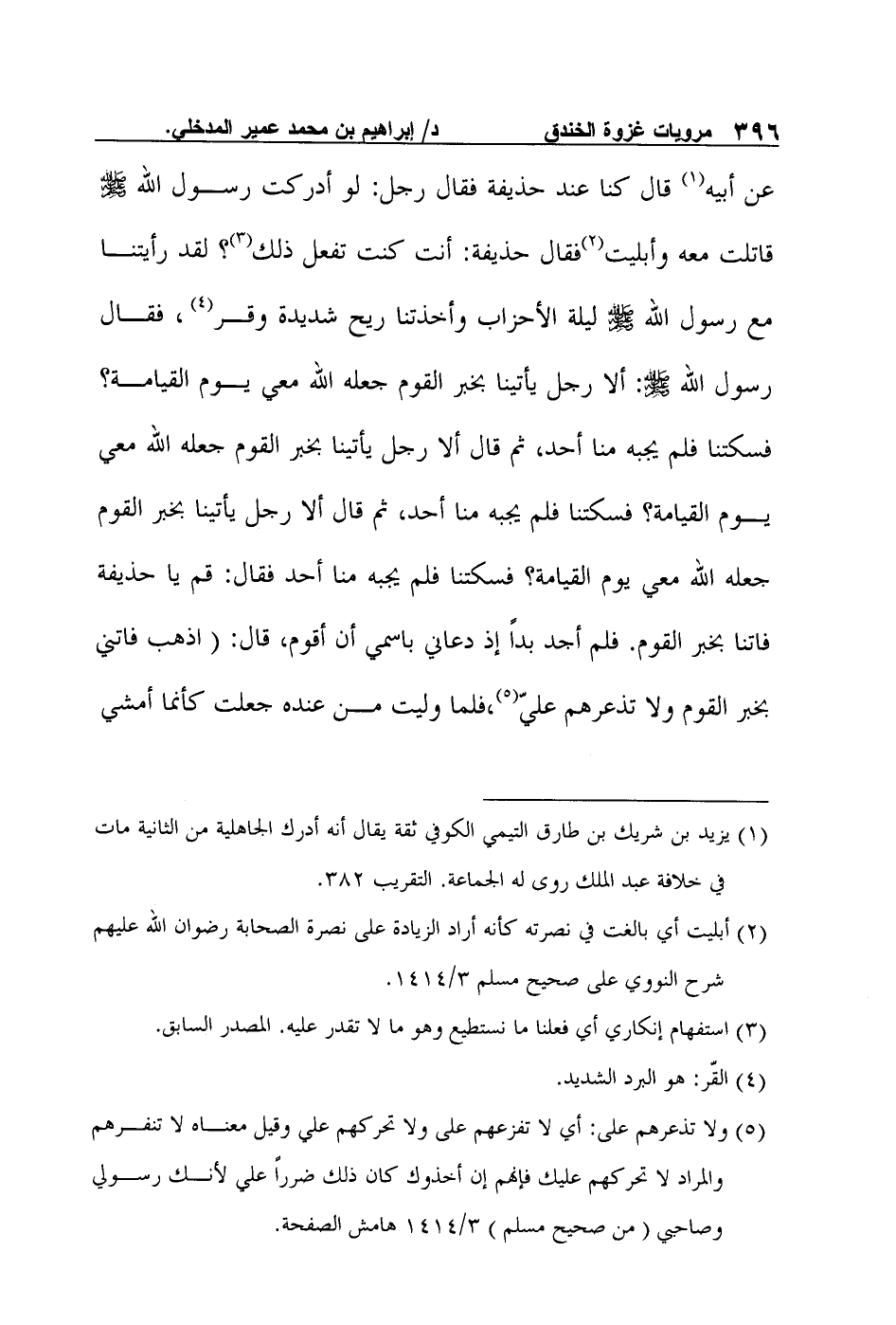 عن أبيه1 قال كنا عند حذيفة فقال رجل: "لو أدركت رسول الله صلى الله عليه وسلم قاتلت معه وأبليت2فقال حذيفة: "أنت كنت تفعل ذلك3؟ لقد رأيتنا مع رسول الله صلى الله عليه وسلم ليلة الأحزاب وأخذتنا ريح شديدة وقر4، فقال رسول الله صلى الله عليه وسلم: "ألا رجل يأتينا بخبر القوم جعله الله معي يوم القيامة؟ " فسكتنا فلم يجبه منا أحد، ثم قال ألا رجل يأتينا بخبر القوم جعله الله معي يوم القيامة؟ فسكتنا فلم يجبه منا أحد، ثم قال: "ألا رجل يأتينا بخبر القوم جعله الله معي يوم القيامة؟ فسكتنا فلم يجبه منا أحد فقال: "قم يا حذيفة فاتنا بخبر القوم". فلم أجد بداً إذ دعاني باسمي أن أقوم، قال: "اذهب فاتني بخبر القوم ولا تذعرهم عليّ" 5،فلما وليت من عنده جعلت كأنما أمشي