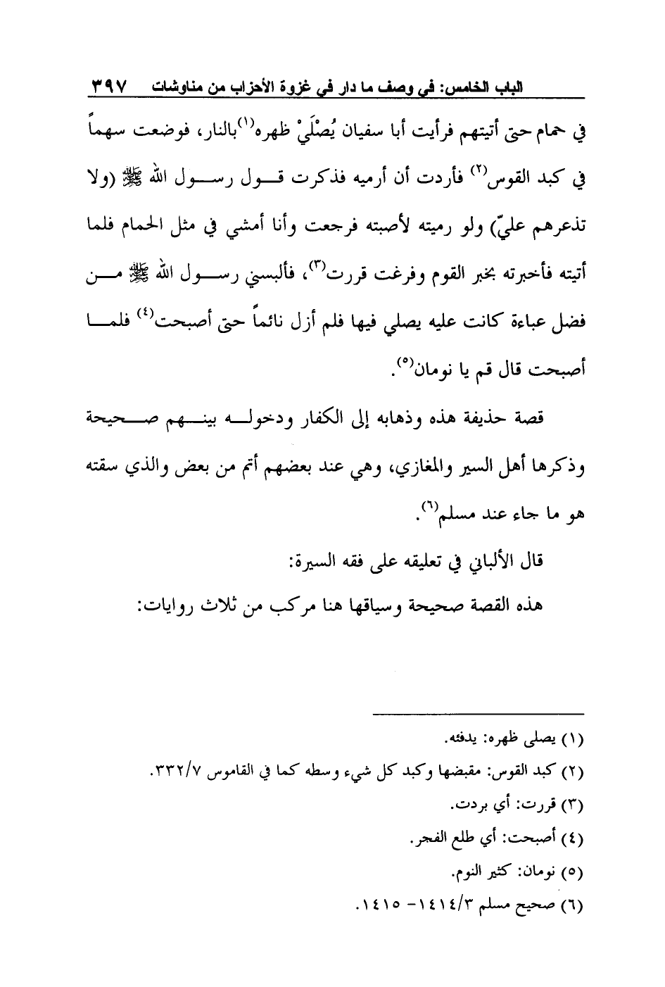 في حمام حتى أتيتهم فرأيت أبا سفيان يُصْلَيْ ظهره1بالنار، فوضعت سهماً في كبد القوس2 فأردت أن أرميه فذكرت قول رسول الله صلى الله عليه وسلم "ولا تذعرهم عليّ" ولو رميته لأصبته فرجعت وأنا أمشي في مثل الحمام فلما أتيته فأخبرته بخبر القوم وفرغت قررت3، فألبسني رسول الله صلى الله عليه وسلم من فضل عباءة كانت عليه يصلي فيها فلم أزل نائماً حتى أصبحت4 فلما أصبحت قال: "قم يا نومان" 5.