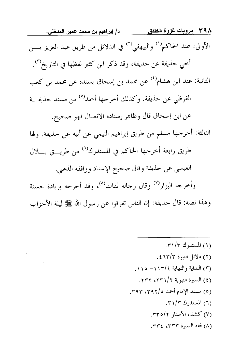 وأخرجه البزار7 وقال رجاله ثقات8، وقد أخرجه بزيادة حسنة وهذا نصه: "قال حذيفة: "إن الناس تفرقوا عن رسول الله صلى الله عليه وسلم ليلة الأحزاب