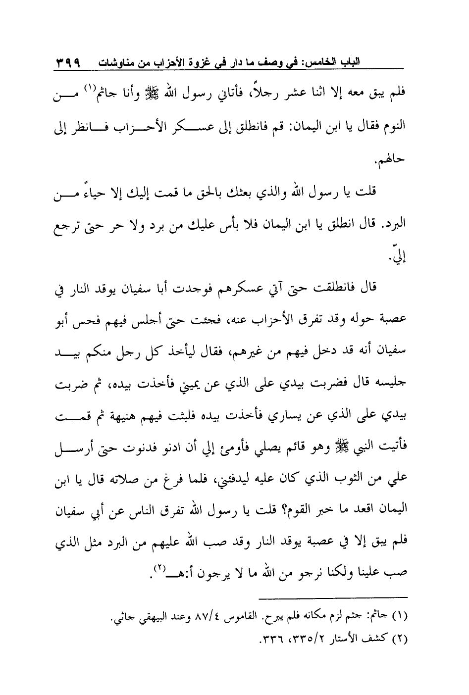 قلت: "يا رسول الله والذي بعثك بالحق ما قمت إليك إلا حياءً من البرد. قال: "انطلق يا ابن اليمان فلا بأس عليك من برد ولا حر حتى ترجع إليّ". قال فانطلقت حتى آتي عسكرهم فوجدت أبا سفيان يوقد النار في عصبة حوله وقد تفرق الأحزاب عنه، فجئت حتى أجلس فيهم فحس أبو سفيان أنه قد دخل فيهم من غيرهم، فقال ليأخذ كل رجل منكم بيد جليسه قال فضربت بيدي على الذي عن يميني فأخذت بيده، ثم ضربت بيدي على الذي عن يساري فأخذت بيده فلبثت فيهم هنيهة ثم قمت فأتيت النبي صلى الله عليه وسلم وهو قائم يصلي فأومئ إلي أن ادنو فدنوت حتى أرسل علي من الثوب الذي كان عليه ليدفئني، فلما فرغ من صلاته قال: "يا ابن اليمان اقعد ما خبر القوم؟ " قلت يا رسول الله: "تفرق الناس عن أبي سفيان فلم يبق إلا في عصبة يوقد النار وقد صب الله عليهم من البرد مثل الذي صب علينا ولكنا نرجو من الله ما لا يرجون"أ: هـ2.