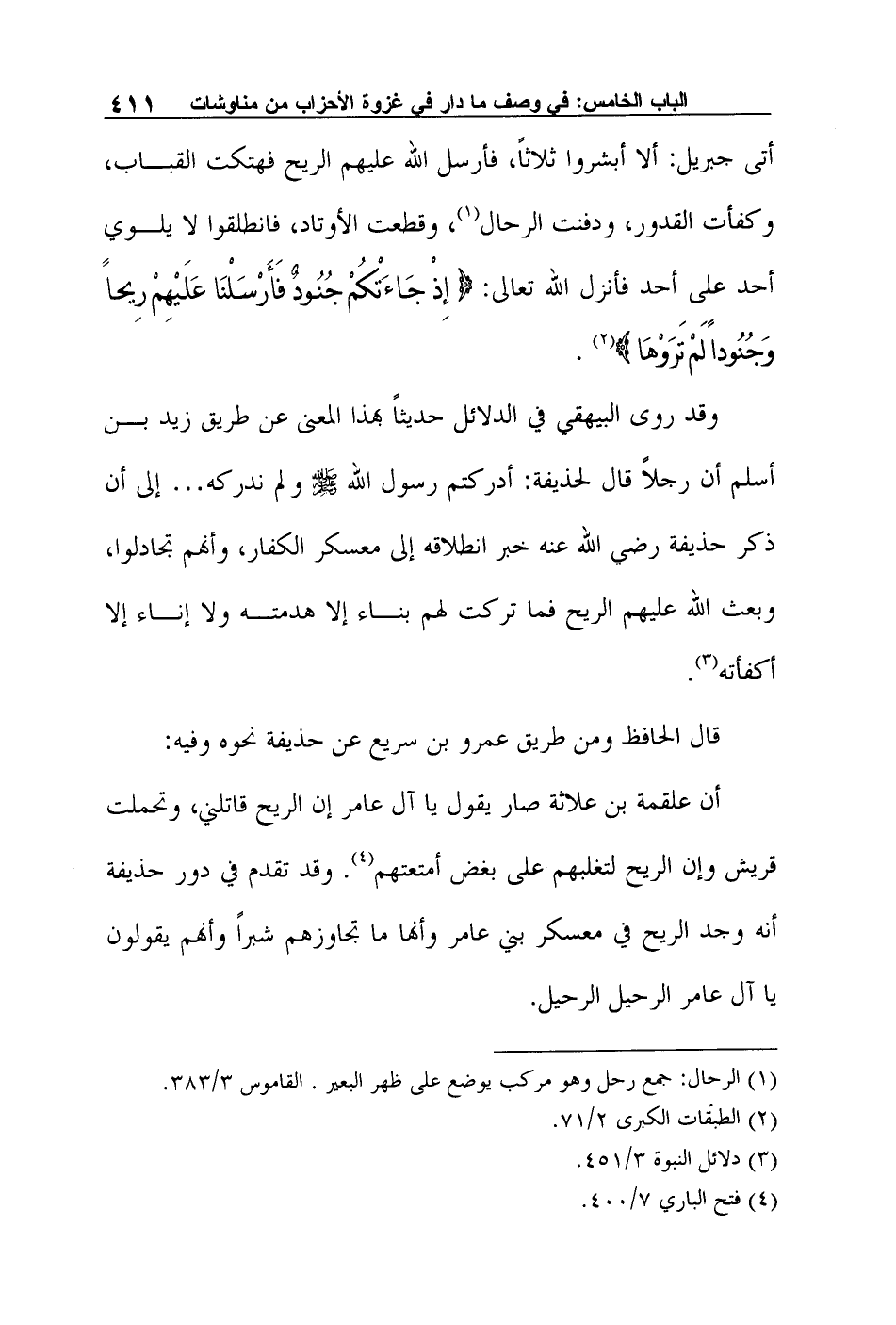 قال الحافظ ومن طريق عمرو بن سريع عن حذيفة نحوه وفيه: "أن علقمة بن علاثة صار يقول يا آل عامر إن الريح قاتلني، وتحملت قريش وإن الريح لتغلبهم على بغض أمتعتهم4. وقد تقدم في دور حذيفة أنه وجد الريح في معسكر بني عامر وأنها ما تجاوزهم شبراً وأنهم يقولون يا آل عامر الرحيل الرحيل".