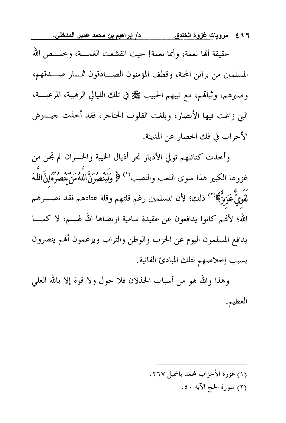 وأخذت كتائبهم تولي الأدبار تجر أذيال الخيبة والخسران لم تجن من غزوها الكبير هذا سوى التعب والنصب1 {وَلَيَنْصُرَنَّ اللَّهُ مَنْ يَنْصُرُهُ إِنَّ اللَّهَ لَقَوِيٌّ عَزِيزٌ} 2 ذلك؛ لأن المسلمين رغم قلتهم وقلة عتادهم فقد نصرهم الله؛ لأنهم كانوا يدافعون عن عقيدة سامية ارتضاها الله لهم، لا كما يدافع المسلمون اليوم عن الحزب والوطن والتراب ويزعمون أنهم ينصرون بسبب إخلاصهم لتلك المبادئ الفانية.