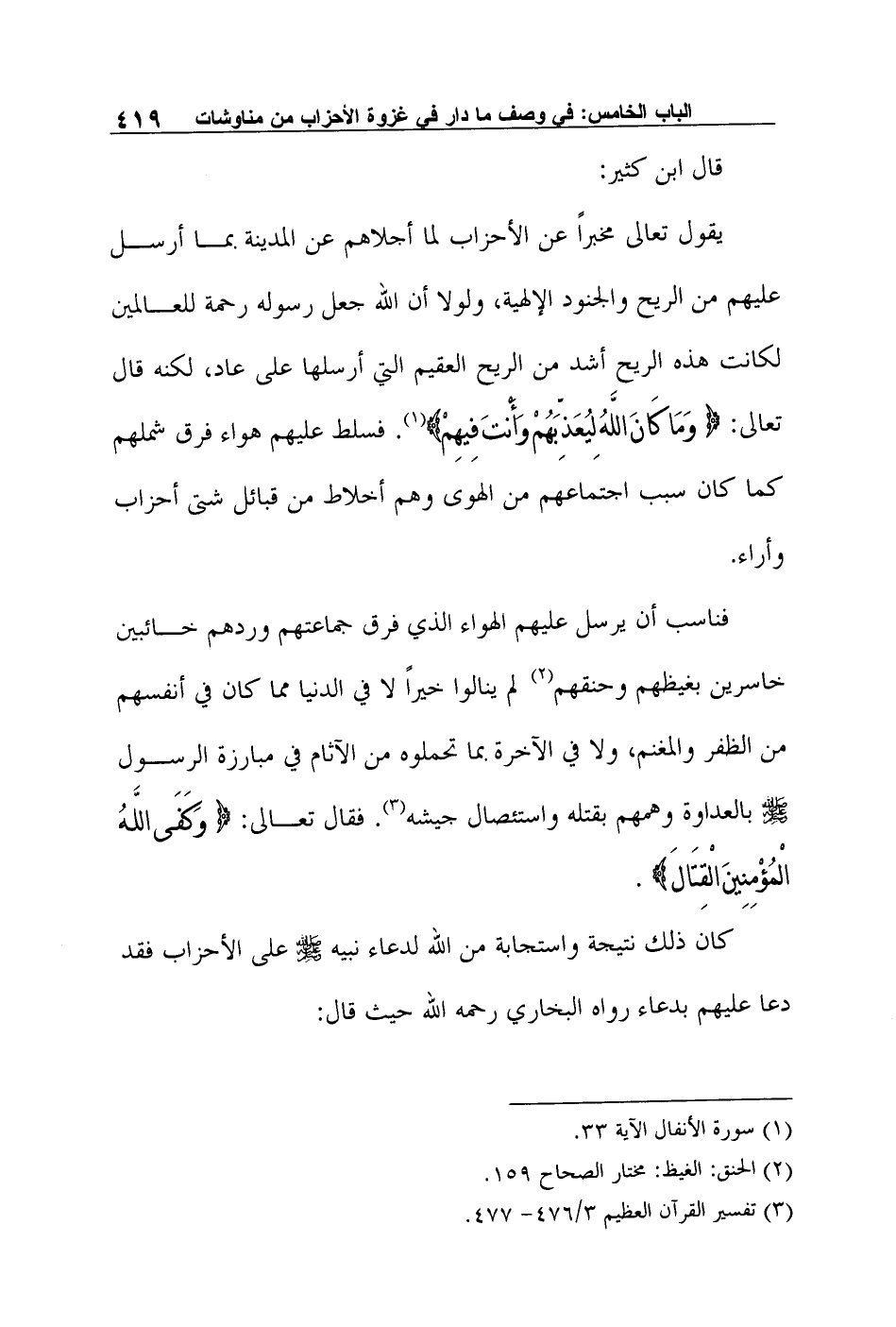 فناسب أن يرسل عليهم الهواء الذي فرق جماعتهم وردهم خائبين خاسرين بغيظهم وحنقهم2 لم ينالوا خيراً لا في الدنيا مما كان في أنفسهم من الظفر والمغنم، ولا في الآخرة بما تحملوه من الآثام في مبارزة الرسول صلى الله عليه وسلم بالعداوة وهمهم بقتله واستئصال جيشه3. فقال تعالى: {وَكَفَى اللَّهُ الْمُؤْمِنِينَ الْقِتَالَ} .