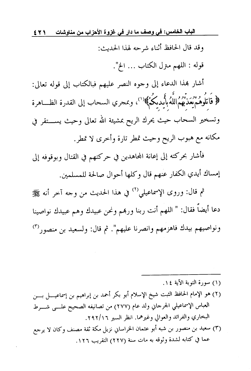 ثم قال: "وروى الإسماعيلي2 في هذا الحديث من وجه آخر أنه صلى الله عليه وسلم دعا أيضاً فقال: "اللهم أنت ربنا وربهم ونحن عبيدك وهم عبيدك نواصينا ونواصيهم بيدك فاهزمهم وانصرنا عليهم". ثم قال: "ولسعيد بن منصور3