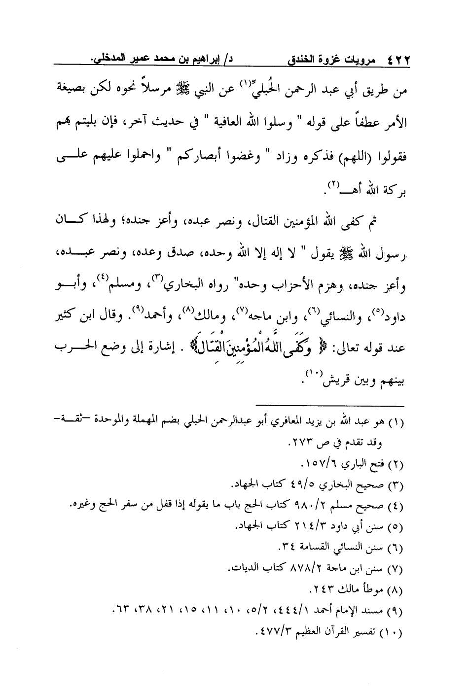 ثم كفى الله المؤمنين القتال، ونصر عبده، وأعز جنده؛ ولهذا كان رسول الله صلى الله عليه وسلم يقول "لا إله إلا الله وحده، صدق وعده، ونصر عبده، وأعز جنده، وهزم الأحزاب وحده" رواه البخاري3، ومسلم4، وأبو داود5، والنسائي6، وابن ماجه7، ومالك8، وأحمد9. وقال ابن كثير عند قوله تعالى: {وَكَفَى اللَّهُ الْمُؤْمِنِينَ الْقِتَالَ} . إشارة إلى وضع الحرب بينهم وبين قريش10.