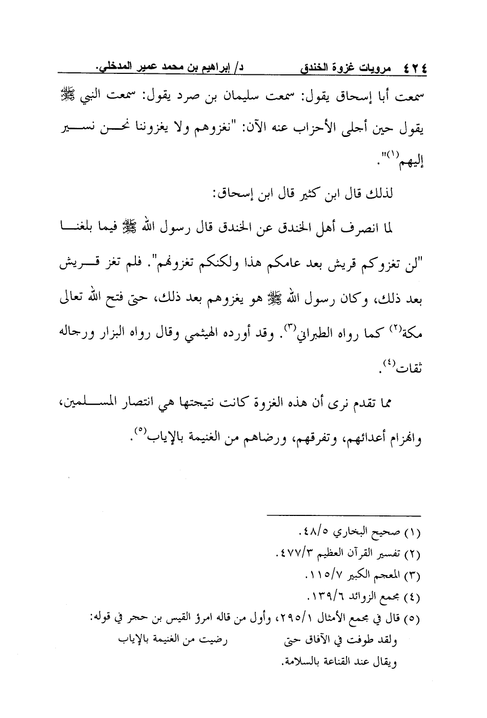 لذلك قال ابن كثير قال ابن إسحاق: "لما انصرف أهل الخندق عن الخندق قال رسول الله صلى الله عليه وسلم فيما بلغنا "لن تغزوكم قريش بعد عامكم هذا ولكنكم تغزونهم". فلم تغز قريش بعد ذلك، وكان رسول الله صلى الله عليه وسلم هو يغزوهم بعد ذلك، حتى فتح الله تعالى مكة2 كما رواه الطبراني3. وقد أورده الهيثمي وقال رواه البزار ورجاله ثقات4.