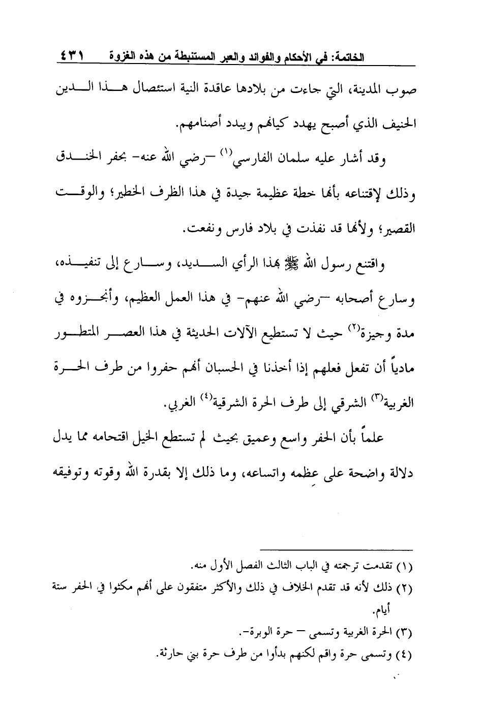 واقتنع رسول الله صلى الله عليه وسلم بهذا الرأي السديد، وسارع إلى تنفيذه، وسارع أصحابه –رضي الله عنهم- في هذا العمل العظيم، وأنجزوه في مدة وجيزة2 حيث لا تستطيع الآلات الحديثة في هذا العصر المتطور مادياً أن تفعل فعلهم إذا أخذنا في الحسبان أنهم حفروا من طرف الحرة الغربية3 الشرقي إلى طرف الحرة الشرقية4 الغربي.