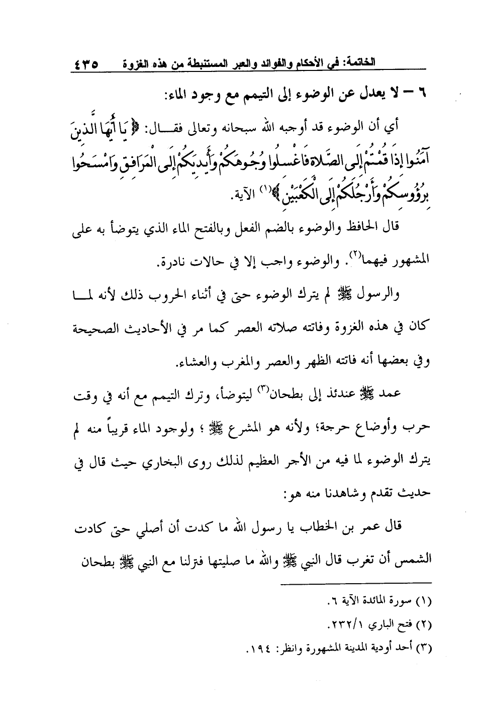 والرسول صلى الله عليه وسلم لم يترك الوضوء حتى في أثناء الحروب ذلك لأنه لما كان في هذه الغزوة وفاتته صلاته العصر كما مر في الأحاديث الصحيحة وفي بعضها أنه فاتته الظهر والعصر والمغرب والعشاء.