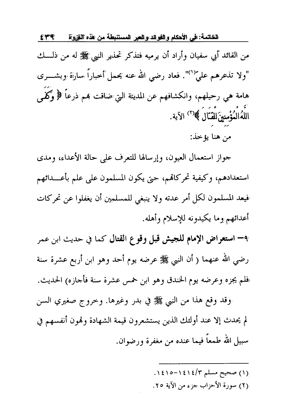 9– استعراض الإمام للجيش قبل وقوع القتال كما في حديث ابن عمر رضي الله عنهما أن النبي صلى الله عليه وسلم عرضه يوم أحد وهو ابن أربع عشرة سنة فلم يجزه وعرضه يوم الخندق وهو ابن خمس عشرة سنة فأجازه الحديث.