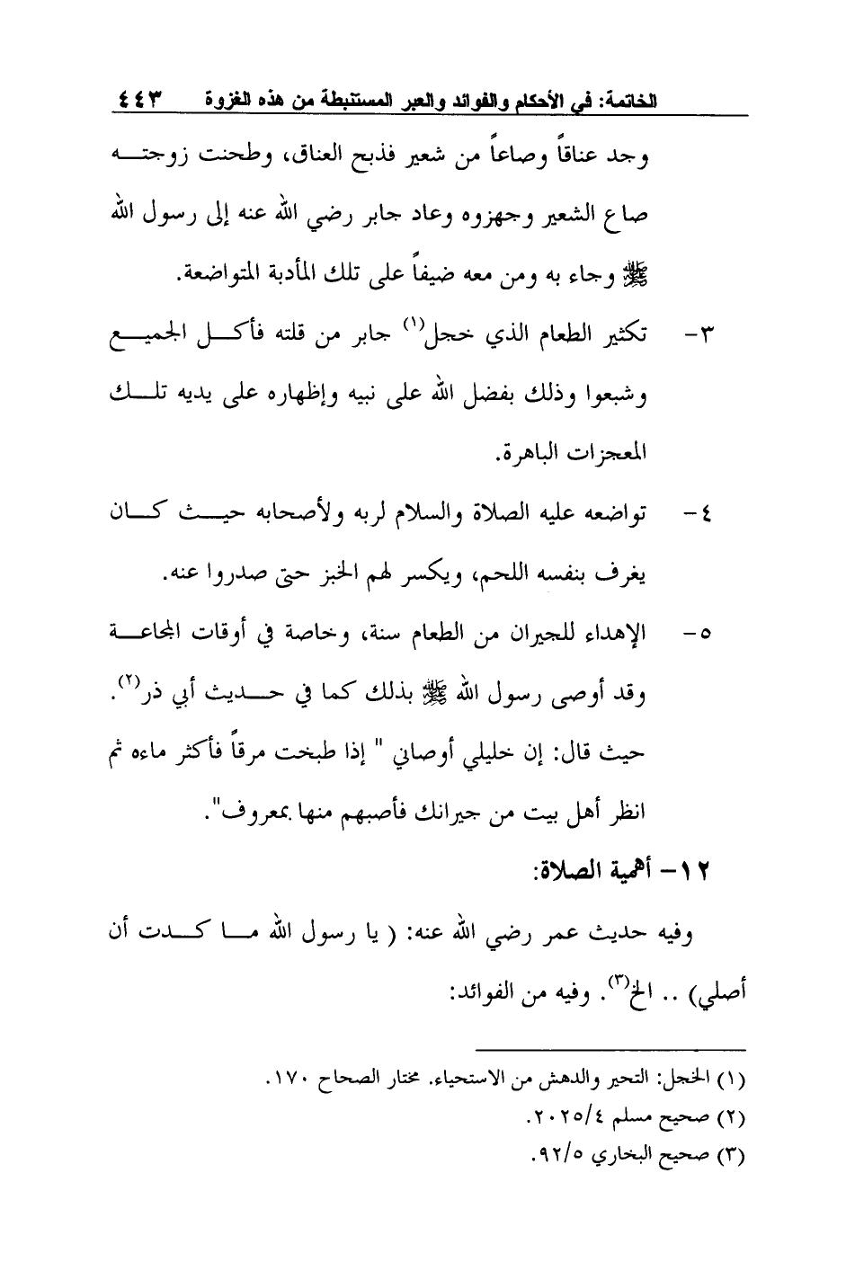 3- تكثير الطعام الذي خجل1 جابر من قلته فأكل الجميع وشبعوا وذلك بفضل الله على نبيه وإظهاره على يديه تلك المعجزات الباهرة.